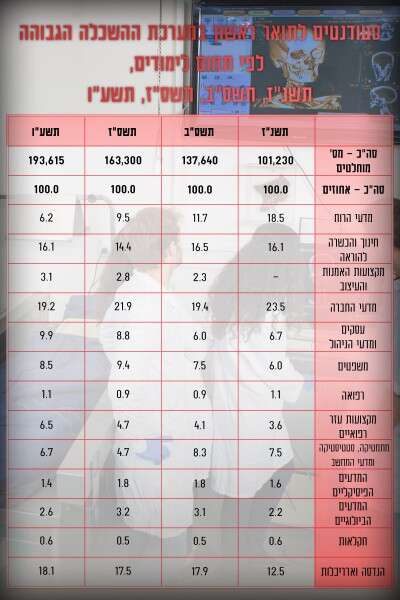 מניתוח התפלגות תחומי הלימוד לתואר ראשון עולה כי מרבית הסטודנטים לומדים את המקצועות הבאים: מדעי החברה כ-19.2 אחוזים, הנדסה ואדריכלות כ-18.1 אחוזים וחינוך והכשרה להוראה כ-16.1 אחוזים.
