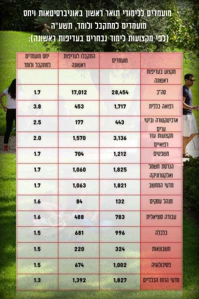 המקצועות המבוקשים ביותר ללימודי תואר ראשון על ידי הסטודנטים החדשים הם: רפואה כללית, כאשר מתוך 3.8 מועמדים מתקבל אחד, ארכיטקטורה ובינוי ערים (2.5) ומקצועות עזר רפואיים (2).