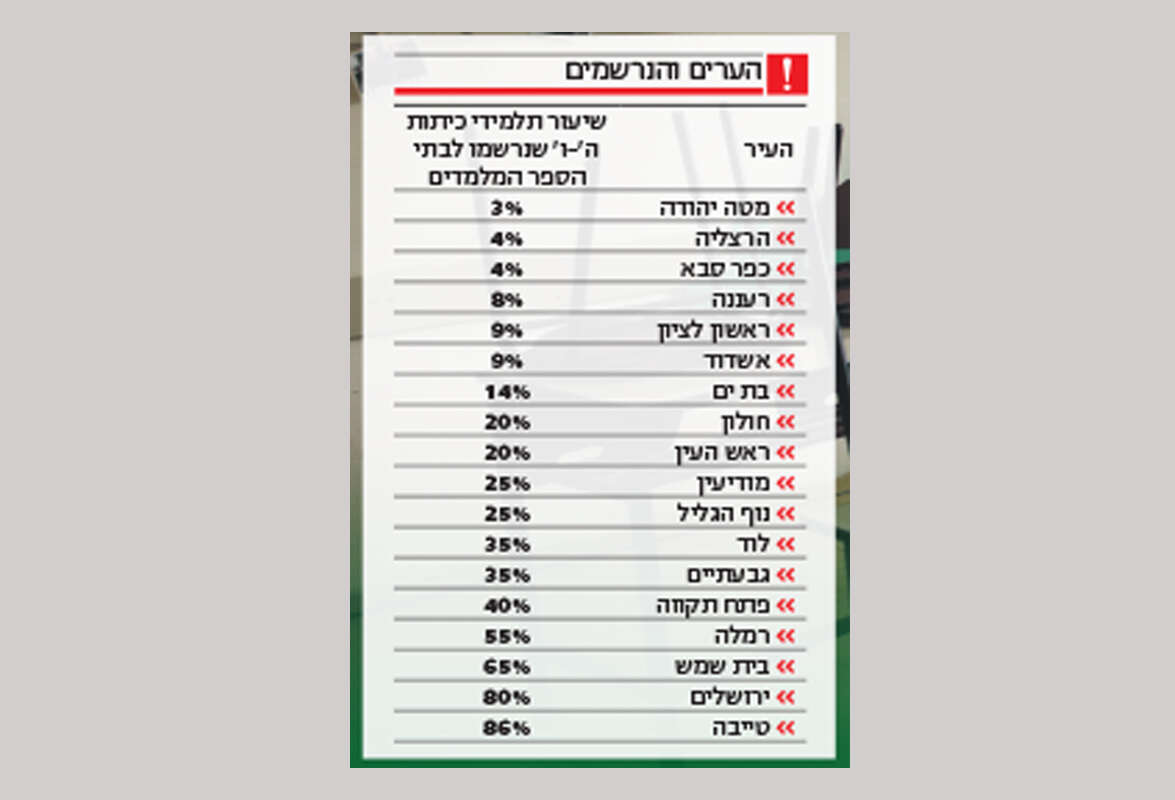 נכון לעתה, ברעננה יש 8% הרשמה בכיתות ה'-ו', ונתניה עם 20% נרשמים. בפתח תקווה רק 40% מהתלמידים נרשמו, ובתל אביב מציינים כי בקרב כל שכבות א'-ו' נרשמו רק כמחצית מהתלמידים - כך שאפשר להניח שמרביתם משתייכים לכיתות הנמוכות.