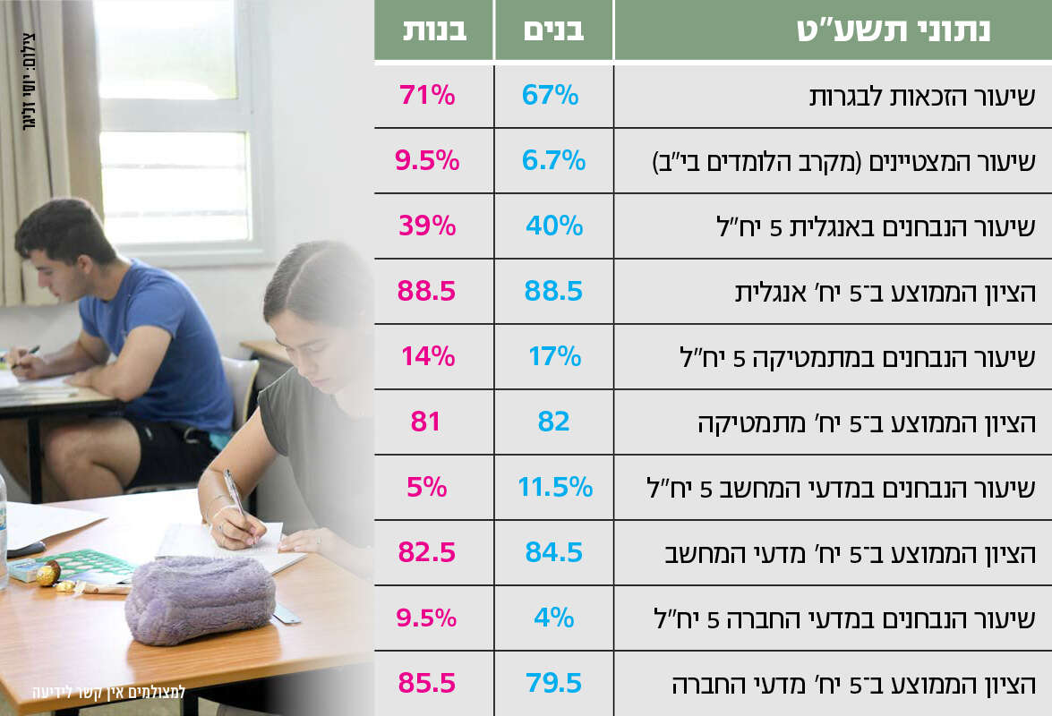נתוני שנת תשע"ט במערכת החינוך מציגים תמונה מעניינת, ולפיהם שיעור הזכאות לבגרות של בנות (71%) גבוה יותר משיעור הזכאות של בנים (67%). גם שיעור התלמידות המצטיינות, שנושק ל־10%, עוקף את הבנים (6.7%). אלא שבכל מה שנוגע למקצועות ריאליים, הבנים מובילים בפער: במתמטיקה שיעור הבנים שנבחנו ברמת 5 יחידות עמד על 17% לעומת 14% מקרב התלמידות - בעוד הבנים מקבלים ציון טוב יותר בנקודה אחת.
