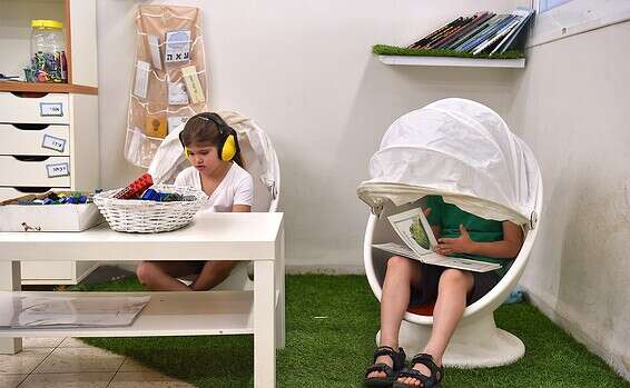 בכיתה של המורה חני אפשר למצוא כל מיני "אמצעי ויסות" - שולחן למידה גבוה, כיסא ביצה עם שמיכה גדולה שהתלמידים יכולים "להתחבא" בו או לעטוף את עצמם, אוהל ועוד. מכולם תופסים את העין בעיקר הכיסאות הירוקים העגולים, ללא משענת. קשה להאמין, אבל זה כיסא שאפשר להתנדנד בו תוך כדי ישיבה - בדיוק מה שהמורה שלכם אמרה לכם לא לעשות בכיתה שמא תיפלו אחורה ותשברו את הראש. בצד, על הקיר, תלויות להן כמה אוזניות גדולות: "אלה אוזניות מסננות רעש", מסבירה חני, "יש כאן הכרה בכך שלא כולם יכולים לעבוד כשיש רעש מסביב. אני לא דוגלת בלהשתיק את הכיתה, אין פה דממת אלחוט. יש פה תלמידים לומדים, פעילים, חושבים וצוחקים יחד, ויש ילדים שזה מפריע להם".