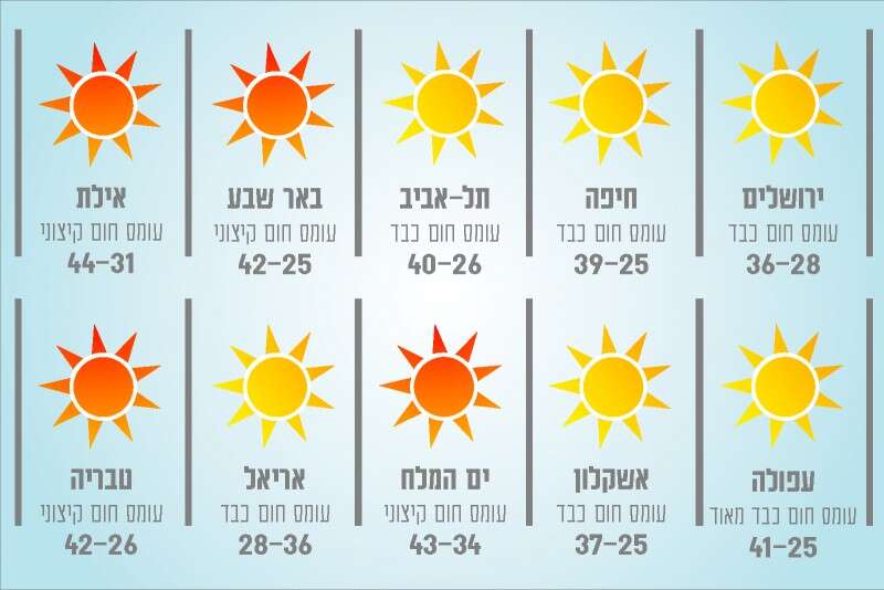 ממטאו־טק נמסר כי מחר יורגש שיא השרב בכל רחבי הארץ והטמפרטורות החזויות הן: באר שבע 43 מעלות, טבריה 42 מעלות, מודיעין 40, ירושלים 39, תל אביב 37 מעלות. משעות אחר הצהריים שוב תנשב רוח ערה לאורך מישור החוף ועדיין קיים חשש משריפות.
