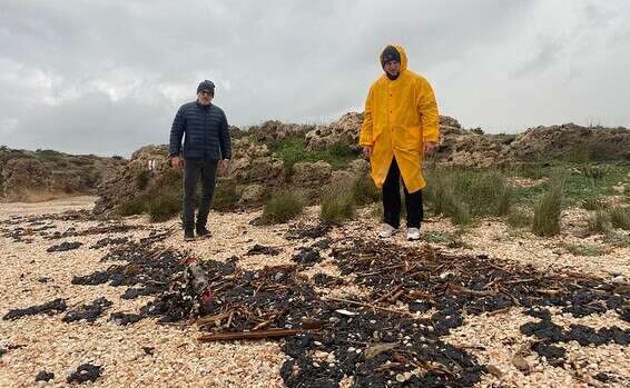 מנכ"ל רשות הטבע והגנים שאול גולדשטיין (מימין) ומנכ"ל המשרד להגנת הסביבה דוד יהלומי לצד פסולת זפת // מנכ"ל רשות הטבע והגנים שאול גולדשטיין (מימין) ומנכ"ל המשרד להגנת הסביבה דוד יהלומי לצד פסולת זפת