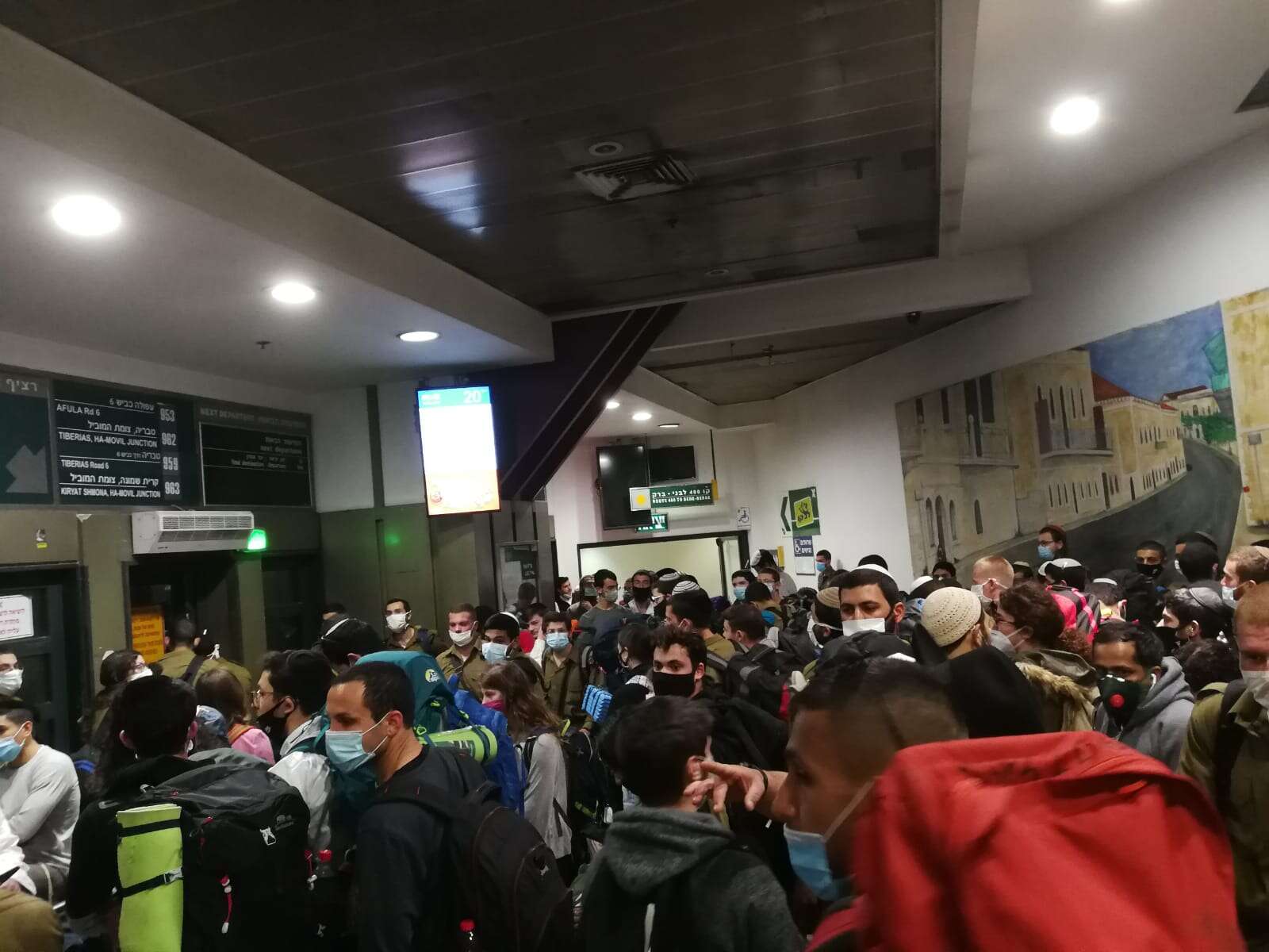 הבוקר נרשמה צפיפות גדולה בתחנה המרכזית בירושלים, וזאת כאשר חיילים רבים מכל הארץ שבים היום לבסיסים הפרוסים ברחבי הארץ באמצעות התחבורה הציבורית. בתחנה המרכזית בירושלים השתרכו תורים ארוכים לעלייה לאוטובוסים. התורים התקיימו ללא הקפדה על שמירת מרחק כמתחייב בהתאם להנחיות משרד הבריאות למניעת התפרצות נוספת של מגפת קורונה.