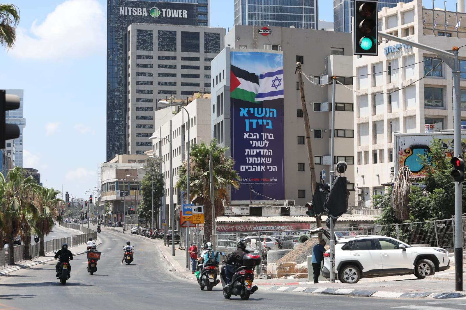 על השלט שתלתה "שלום עכשיו" נכתב "הנשיא ביידן, ברוך הבא לשתי המדינות שאנחנו הכי אוהבים" • מהתנועה נמסר: "זו תזכורת לכך שפתרון שתי המדינות הוא אינטרס שלנו, הישראלים" • בחודש שעבר נתלה שלט דומה ברמת גן