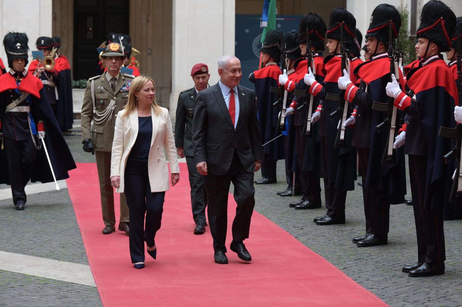 במסגרת ביקורו המדיני, ראש הממשלה בנימין נתניהו נפגש היום (שישי) עם ראש ממשלת איטליה ג'ורג'ה מלוני, בפלאצו קיג'י, ברומא. ראש הממשלה נתניהו התקבל במשמר כבוד, במהלכו התנגנו המנוני שתי המדינות.