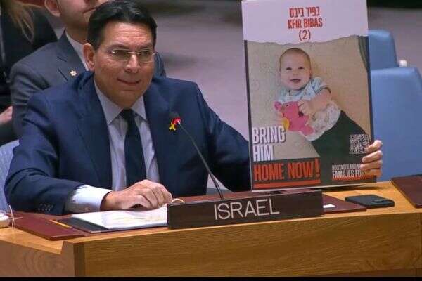 דנון הציג תמונה של כפיר ביבס ואמר: "כפיר היה בן תשעה חודשים כאשר נלקח ממיטתו יחד עם אחיו בן הארבע, אריאל, והוריו, שירי וירדן. מאז הוא נותר באפלת מרתפי הטרור של חמאס. מאז לא התקבלה כל ידיעה על מצבו – לא ביקורי הצלב האדום ולא שום זעקה מהאו"ם".