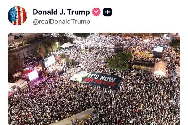 נשיא ארצות הברית דונלד טראמפ פרסם הלילה (בין שבת לראשון) תמונות מכיכר החטופים בחשבון האישי שלו ברשת החברתית Truth Social. בציוצים של הנשיא מופיעים אלפי המפגינים בכיכר החטופים עם השלט "זה עכשיו או לעולם לא".