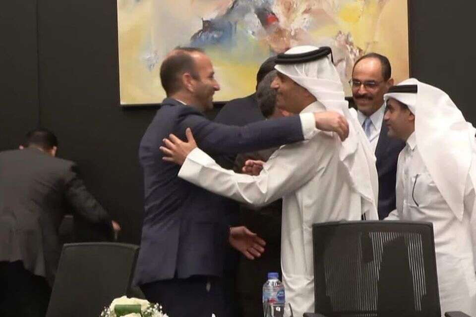בכלי תקשורת ערביים פורסמו תמונות נדירות במיוחד מתוך חדר המו"מ בשארם א-שייח, שם מתקרבים לחתימה על עסקה. בין התמונות שפורסמו, אחת חריגה במיוחד, של ראש ממשלת קטאר מוחמד אל-ת'אני לוחץ יד לאלוף במילואים ניצן אלון, שבועות בודדים אחרי התקיפה שגררה מתיחות חסרת תקדים בין ישראל לדוחא