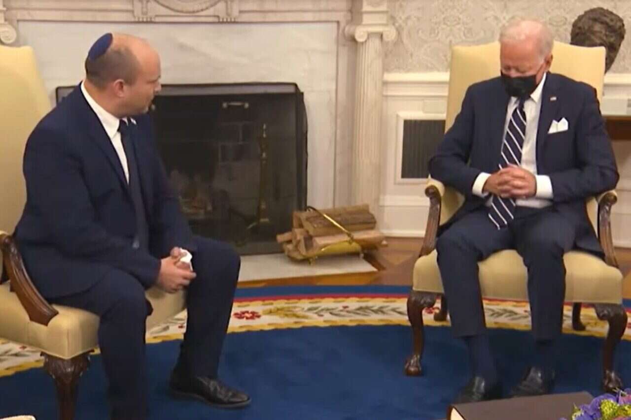 "ניקר" במהלך הפסגה המדינית? בקטע מפגישת ביידן-בנט, נשיא ארה"ב נראה מנומנם במהלך דברי ראש הממשלה על הקשר בין ישראל לארה"ב. לא ברור אם הוא אכן תפס תנומה, שכן ייתכן שמדובר בזווית צילום לא מחמיאה.