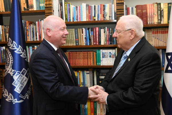 נשיא המדינה, ראובן ריבלין, נועד היום (ראשון) עם ג'ייסון גרינבלאט השליח המיוחד של נשיא ארה"ב. ההערכה היא כי גרינבלאט העלה במפגש עם הנשיא את השלכות פרסום עסקת המאה לאחר הבחירות וכן דנו השניים במשבר הפוליטי שנוצר לאחר הבחירות.