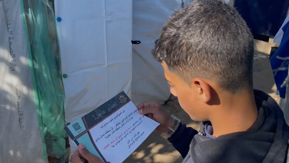 תיעוד: צה"ל פיזר היום (רביעי) כרוזים מהאוויר במרכז הרצועה בהם אזהרה מפורשת עבור האוכלוסייה הפלשתינית מחזרה לצפון הרצועה.