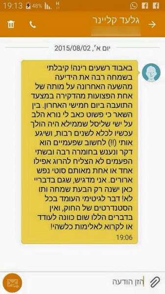 שלוחת לכיש של פרקליטות המחוז הדרומי הגישה אחר הצהריים לבית משפט השלום באשדוד כתב אישום נגד גלעד קליינר, מי שנעצר ביום שני בשנית לאחר שהעביר מסרון בו הביע שמחה על מותה של שירה בנקי ז"ל, שנרצחה במהלך מעצד הגאווה בירושלים. עם הגשת כתב האישום הוברר כי כתב פוסטים נוספים ובו הביע רצון לראות במותם של הורי התינוק הפלשתיני שכן לליבוי השנאה.