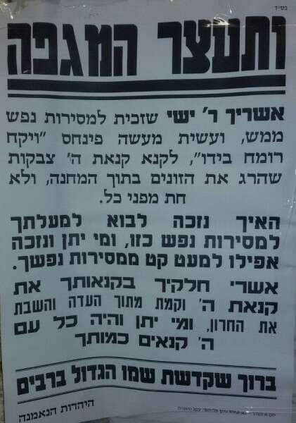 למדו את הלקח? כרוזים המשבחים את ישי שליסל, מי שדקר למוות את שירה בנקי בת ה-16 ופצע חמישה אחרים במצעד הגאווה בירושלים, נתלו בבני ברק ובירושלים.