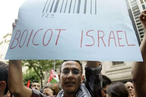 מפגין קורא לחרם על ישראל במהלך הפגנה בברצלונה // צילום: רויטרס (ארכיון) // מפגין קורא לחרם על ישראל במהלך הפגנה בברצלונה