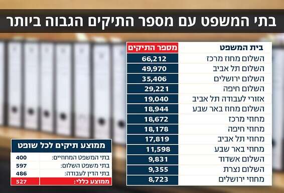 מתוך כלל השופטים, אלו המתמודדים עם מספר התיקים הרב ביותר הם השופט דניאל דמביץ מבית משפט השלום בירושלים, עם מלאי של 4,585 תיקים; סיגלית גץ־אופיר מבית משפט השלום בחיפה עם 4,192 תיקים; עינב גולומב מבית המשפט המחוזי נצרת עם 3,965 תיקים; אמיר צ'כנוביץ מהשלום תל אביב עם 3,809 תיקים; ואליעד וינשל־מרגל מבית משפט השלום ירושלים עם 3,601 תיקים.