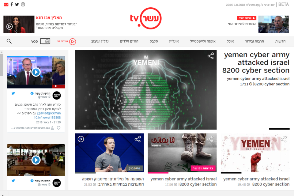 מתקפת סייבר על התקשורת הישראלית: קבוצת האקרים שקוראת לעצמה "צבא הסייבר של תימן" פרצה הלילה (רביעי) לאתר של חדשות ערוץ 10. עמוד הבית של האתר הוצף בידיעות באנגלית, עם תמונות שמסמלות השתלטות צבאית או דיגיטלית על חיל המודיעין של ישראל.