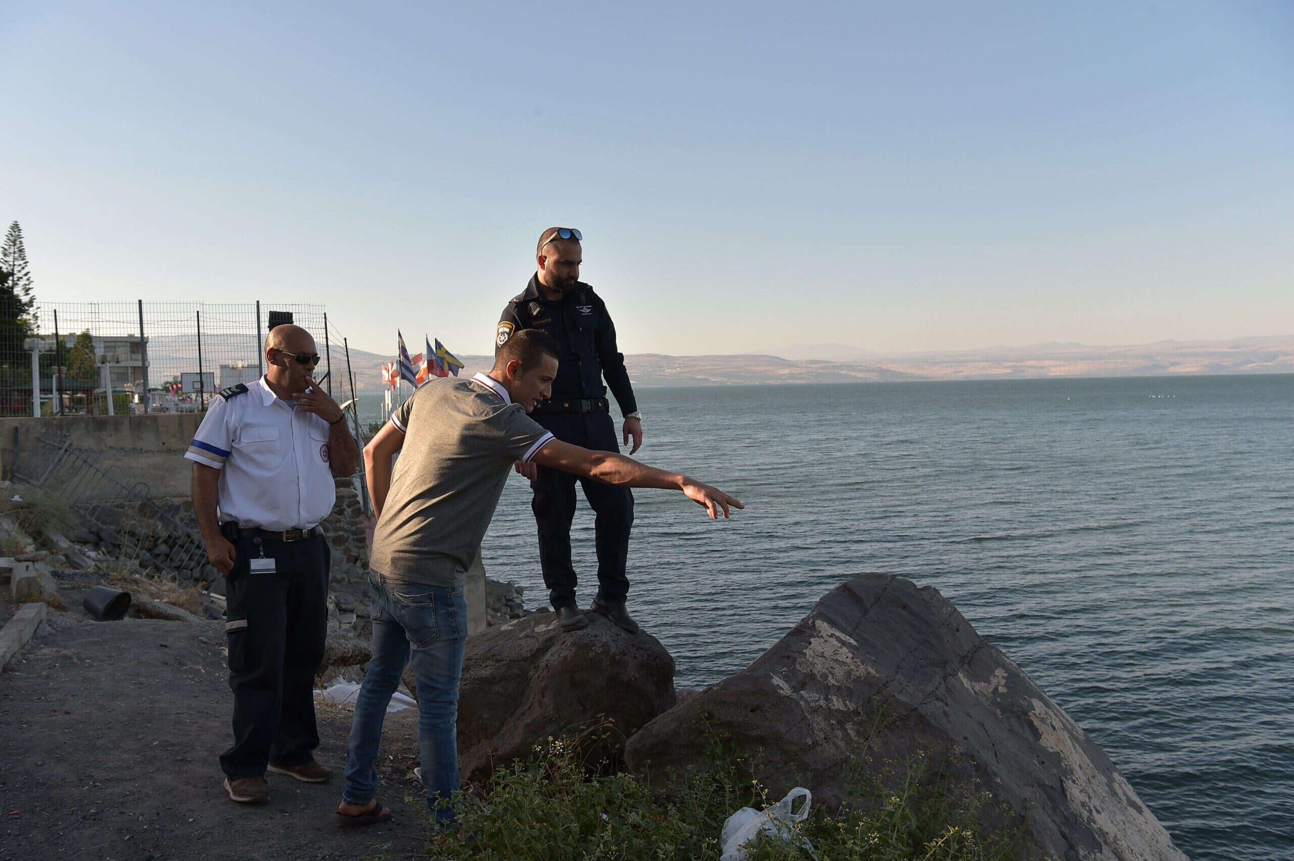 סופ"ש טרגי של טביעות // צילום: גיל אליהו/ג'יני // אזרח מצביע על מקום נפילתו של הגבר שטבע למוות בכינרת // צילום: גיל אליהו/ג'יני