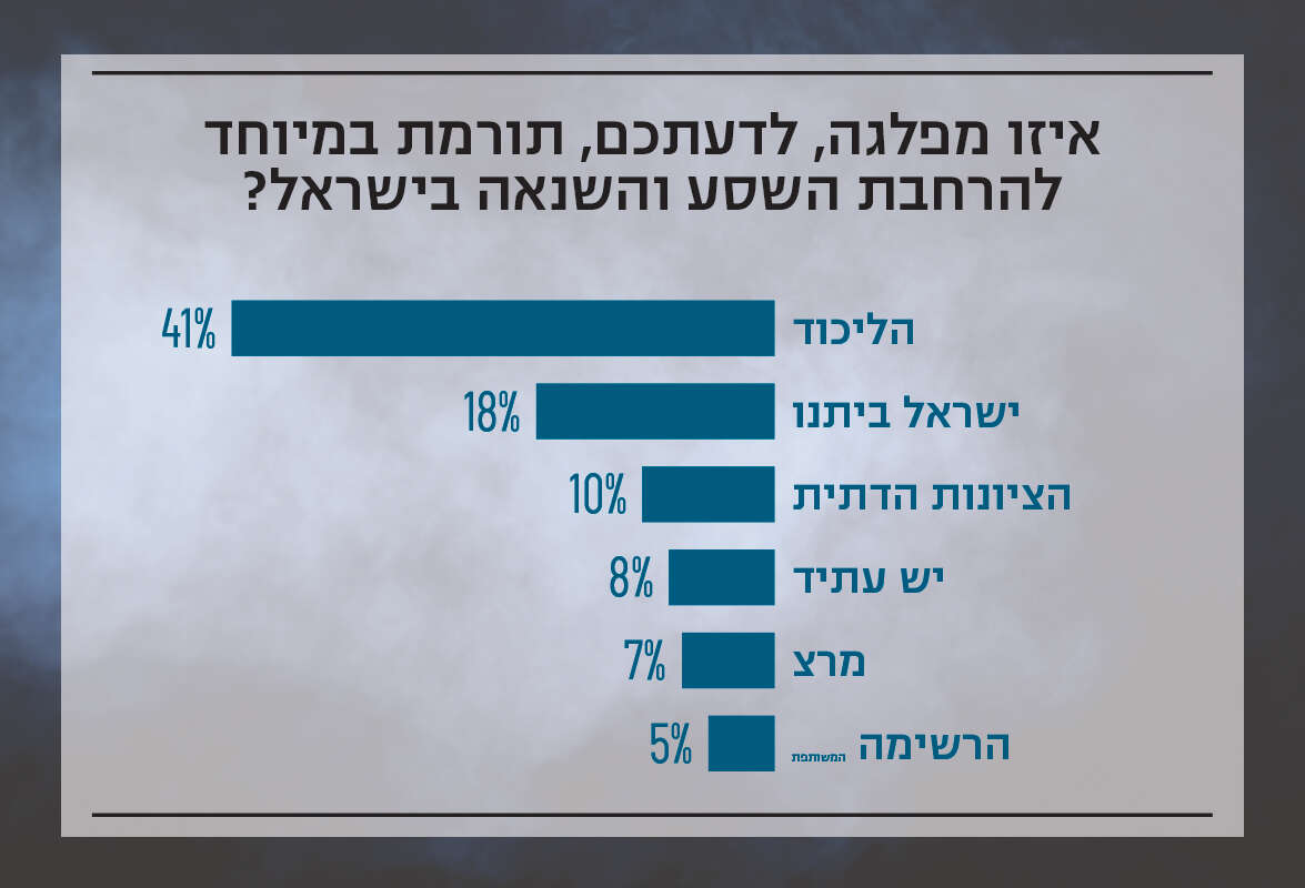 41% מהישראלים חושבים שמפלגת הליכוד היא המפלגה שתורמת יותר מאחרות להרחבת השסע והשנאה בישראל. 18% חושבים שמפלגת ישראל ביתנו תורמת לכך יותר מכולן, 10% מצביעים על מפלגת הציונות הדתית ועוד 7% על מרצ.