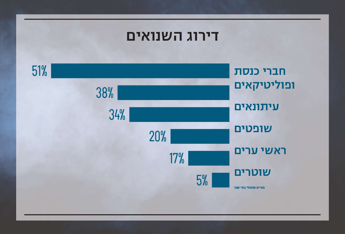 "מדד השנאה" בוחן גם את היחס של הישראלים לחלקים שונים בציבוריות הישראלית. מניתוח הנתונים עולה כי במקום הראשון והלא מכובד ניצבים חברי הכנסת עם 51%, ואחריהם ברשימה לפי הסדר - עיתונאים (38%), שופטים (34%), ראשי ערים (20%), שוטרים (17%) ומנהלי בתי ספר ומורים (5%).