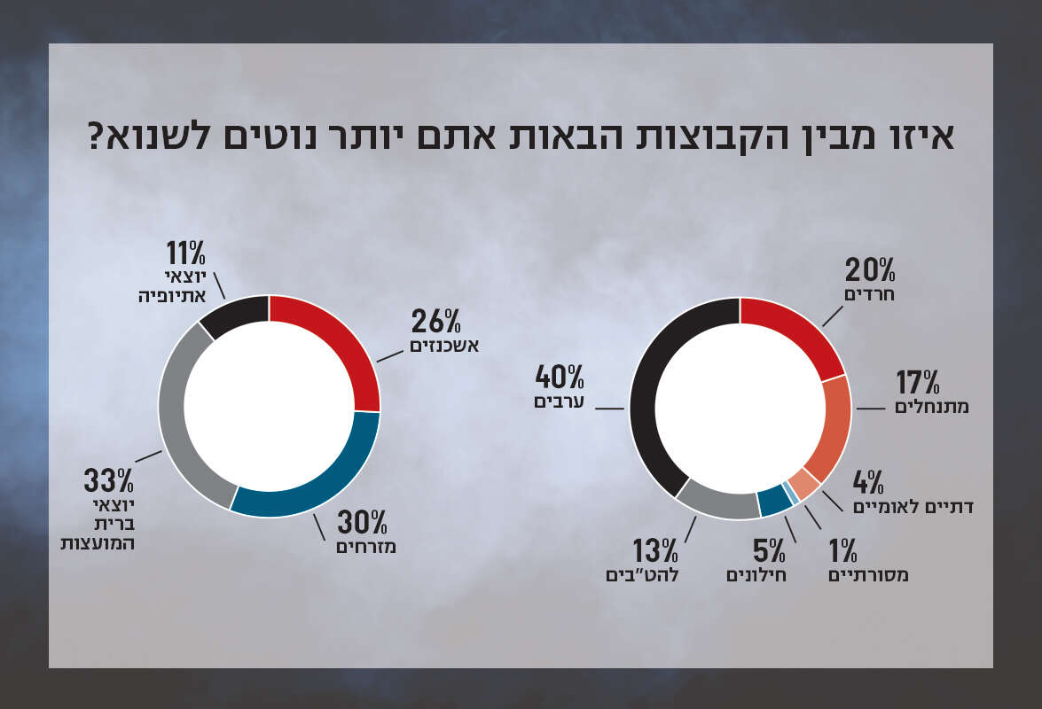 השנאה הכי גבוהה לערבים היא בקרב מצביעי ימינה (77%) והליכוד (72%). היא נמוכה, אולי במפתיע, בקרב יוצאי בריה"מ ומצביעי ישראל ביתנו. לעומת זאת, השנאה הכי גבוהה לחרדים היא בקרב מצביעי ישראל ביתנו (55%). החילונים שונאים את החרדים יותר מאשר את הערבים. בקרב שונאי החרדים - 22% הם מצביעי שמאל. לעומת זאת רק 5% מהחרדים שונאים חילונים ו־0% ממצביעי השמאל שונאים ערבים.