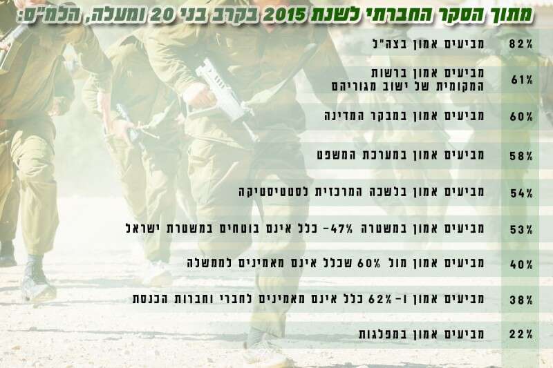 סקר חדש של הלשכה המרכזית לסטטיסטיקה מלמד כי הציבור הישראלי בוטח בצה"ל, עם הבעת אמון של 82% מהישראלים. כמו כן בתחתית סולם האמון נמצאות המפלגות שזכו ל-22% מאמון הציבור. 57% מהישראלים כלל אינם מאמינים לאמצעי התקשורת.