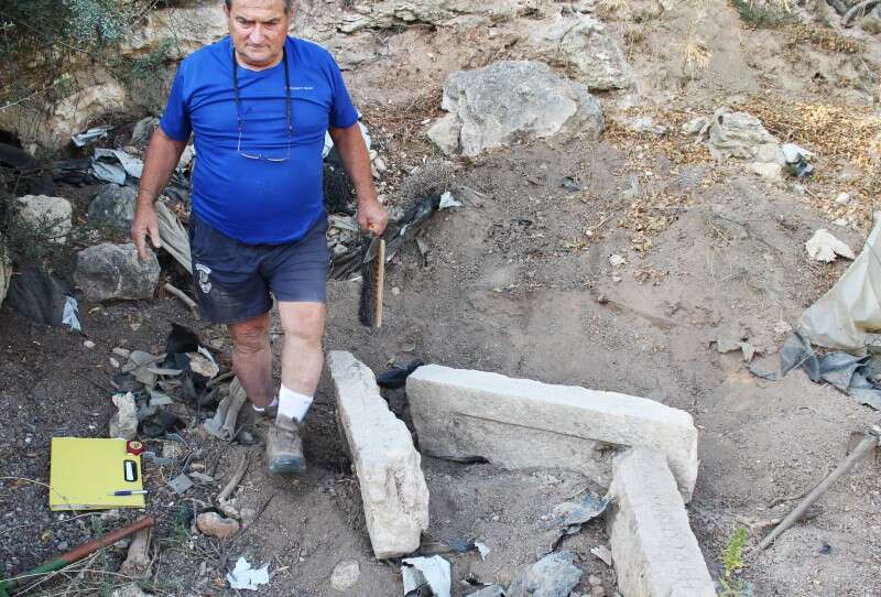 אהרוני אמיתי ליד הכתובות שנחשפו // צילום: גיא פלג, באדיבות רשות העתיקות
