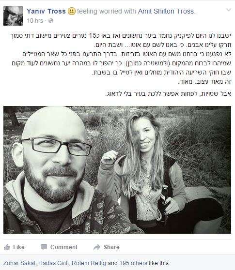 יניב טרוס העלה פוסט בפייסבוק בו הוא מספר על חוייה מפחידה ומסוכנת שעבר ביער נחשונים ביום שבת האחרון, בה הוא ואישתו וכמו כן זוג נוסף נתקפו ע"י חבורת נערים בגילאי 12-14 שהשליכו לעברם אבנים משום שנסעו ביום שבת.