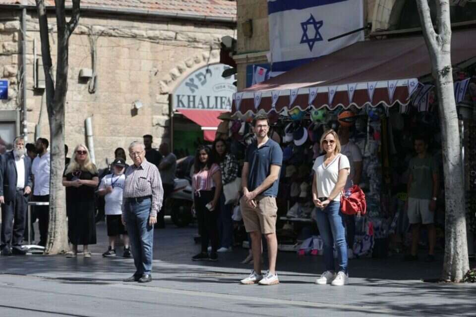 חיילים עומדים דום בת"א, צילום: קוקו התנועה נעצרה במרכז ת"א, צילום: קוקו מכבדים את זכר ששת המילניום בקניון בחיפה, צילום: הרצי שפירא אזרחים עומדים בצפירה בירושלים, צילום: אורן בן חקון