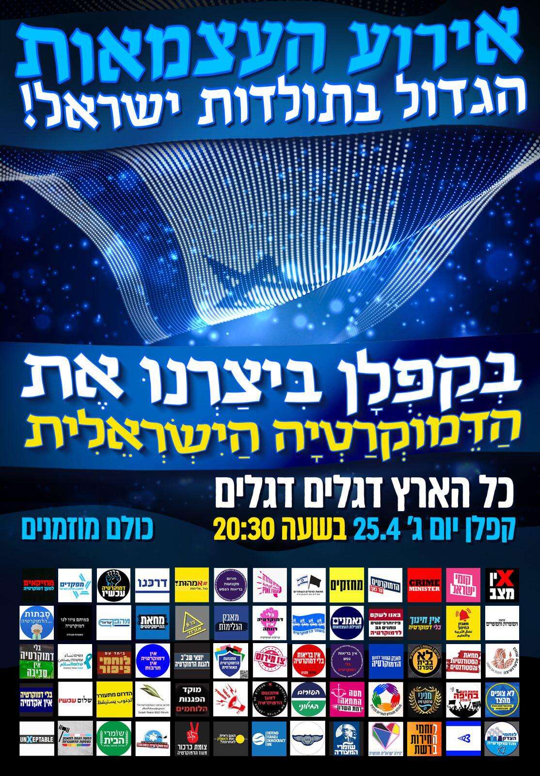 המארגנים הזמינו את האזרחים לייצור את "תנועת המחאה הגדולה בהיסטוריה הישראלית ולבוא ולחגוג את ישראל חופשית ודמוקרטית. הציבור מוזמן להגיע מדן ועד אילת לאירוע העצמאות והדמוקרטיה".