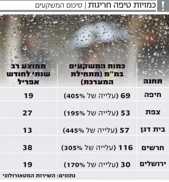 עוד מעלים נתוני השירות כי אירוע המשקעים מתאפיין בטמפרטורות נמוכות מאוד יחסית לתקופה זו. בבית דגן, לדוגמה, נמדדה אתמול טמפרטורת מקסימום של כ־15 מעלות - וזאת בהשוואה לממוצע רב שנתי של 24 מעלות. גם בירושלים טמפרטורת המקסימום הייתה כ־9 מעלות, כשהממוצע לחודש אפריל הוא 21.5 מעלות. אגב, טמפרטורות כה נמוכות בשעות היום באפריל נמדדו ב־65 השנים האחרונות פעמיים בלבד: ב־1990 וב־1997.