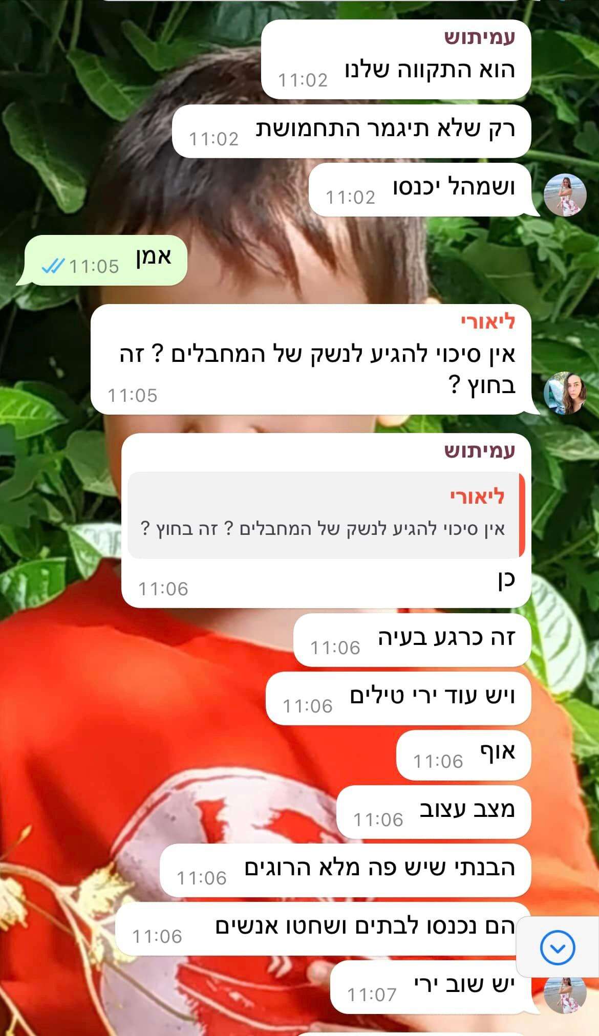 "מעדכנת: אין חדש מעמית. היא לא היתה בין בני הערובה בקיבוץ. אנחנו עדיין לא יודעים איפה היא ומה איתה. אף גורם רשמי לא דיבר איתנו ולו פעם אחת כדי לעדכן במשהו או אפילו להגיד שמנסים לחפש אותה. פעם אחרונה שדיברתי איתה היתה במרפאה בבארי. ירויה.
