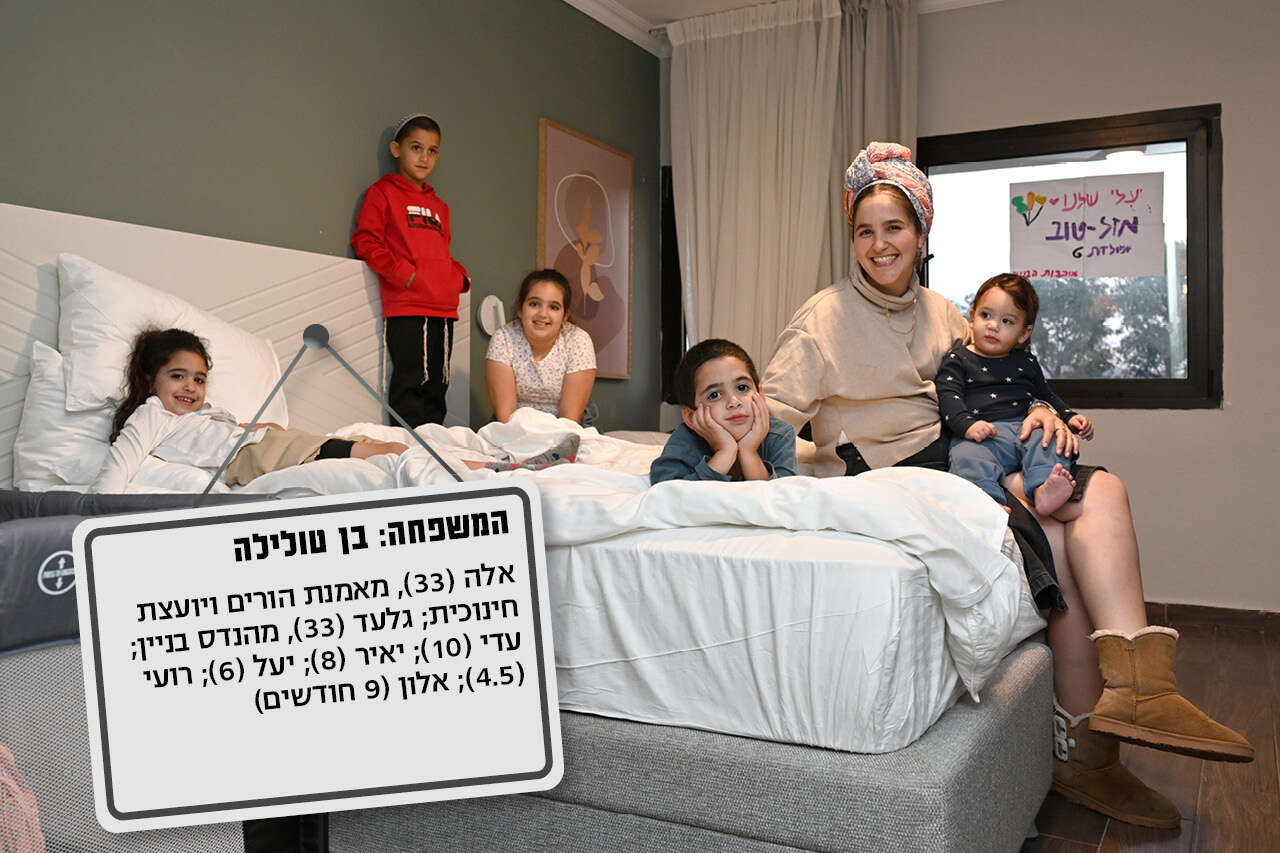 לאחרונה חזרה אלה לעבודתה כמאמנת. את השיחות היא עושה בבקרים דרך הזום, כשאלון הקטן מנמנם לצידה. גם עדי בת ה־10 מצאה תעסוקה לשעות שאחרי הלימודים והיא מתנדבת במלון כבייביסיטר לילדים שאביהם נמצא במילואים. "הילדים מאושרים פה", מחייכת אלה כשיעל ורועי מקפצים על המיטה. "הם בלה-לה-לנד ומרגישים בחופש. אני מקפידה שנאכל ביחד בחדר ארוחת ערב, וזה זמן משפחה. אנחנו עושים טוסטים ולמדתי להכין במיקרו אורז, פסטה ופתיתים".