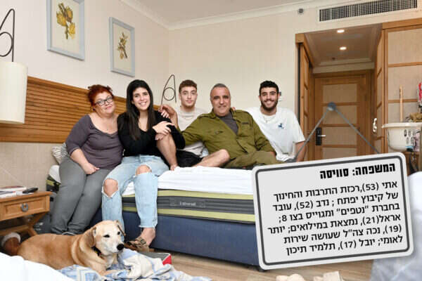 "במלון מתייחסים אלינו יפה, אבל יש פגיעה בחיי היומיום. כשאראל ויותם מגיעים מהצבא, אין להם בית ופינה שקטה. זה מסובך לכבס פה את המדים, ואי אפשר להכין להם ארוחות מתי שרוצים. לא מעט חברים עזבו לדירות שכורות, כי לא פשוט לישון משפחה שלמה בחדר אחד, במיוחד כשיש ילדים קטנים. אז מצד אחד אנ חנו פחות בוורידים אחד של השני, אבל מצד שני את רוצה להישאר עם כל הקהילה שלך".