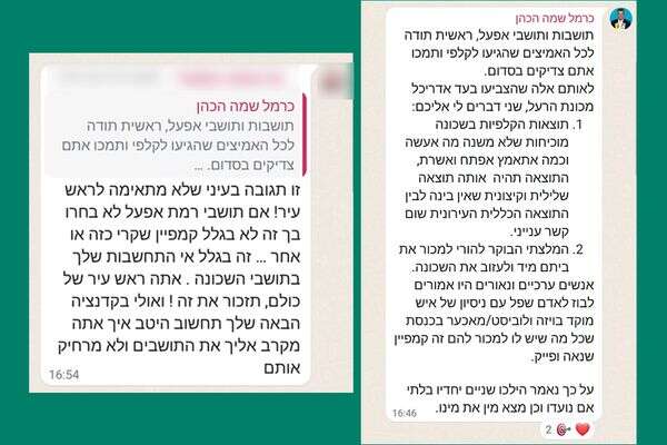 "היטתי את שתי הלחיים, לא נותרה לי לחי שלישית", זו הייתה בחירת המילים הלא מוצלחת של ראש העיר: האם כרמל שאמה הכהן, ראש עיריית רמת גן, יתנקם בשכונת רמת אפעל, עקב העובדה שהפסיד בשכונה ליו"ר האופזיציה ליעד אילני? בקבוצת הווטסאפ השכונתית כתב היום (רביעי) שאמה הכהן: "אני אישית לא אקדיש יותר שנייה מעצמי למי שאין הכרת הטוב ויש בו רוע צרוף". בשבועות האחרונים ליעד ליאני ניהל נגד כרמל שאמה קמפיין נגטיבי ואגרסיבי שככלל הכפשות וסרטונים.