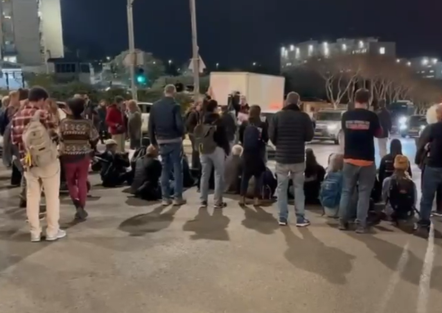 כוח משטרה נמצא במקום • המפגינים ובהם משפחות של חטופים התיישבו על הכביש בצומת רופין בירושלים סמוך למשרד ראש הממשלה