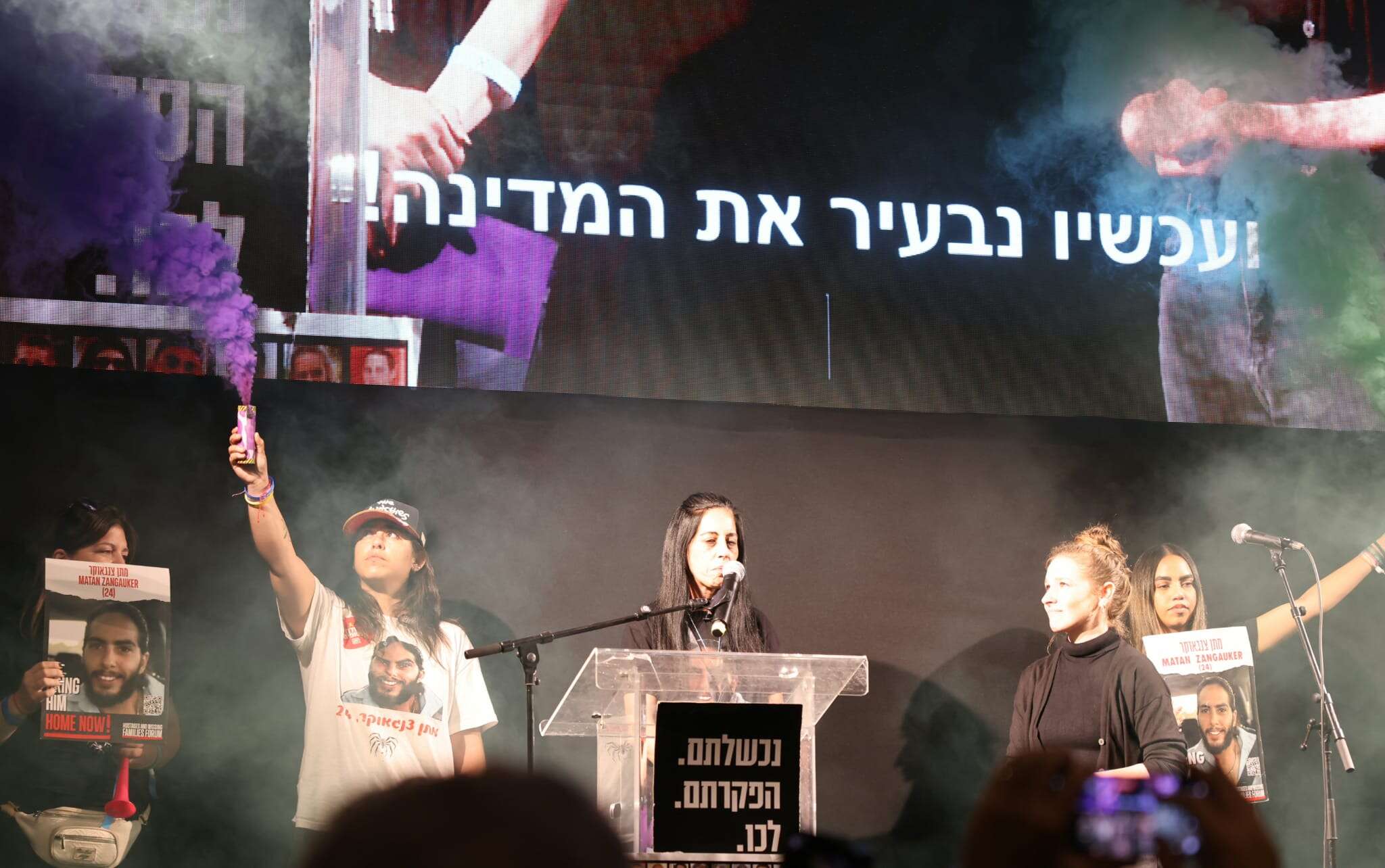 תחילה, במהלך העצרת, פנתה הערב (שלישי) מעל במת העצרת עינב צנגאוקר, אמו של מתן החטוף בעזה, לרה"מ נתניהו: ״ניהלת קמפיין נגדי, נגד המשפחות, נגד עם ישראל - האלימות שאנחנו חווים ברחובות היא בגלל שאתה מסית נגדנו, ממשלתך והשופרות שלך קוראים לנו בוגדים. אתה הוא הבוגד, בגדת בעמך, בגדת במצביעיך, בגדת במדינת ישראל״.