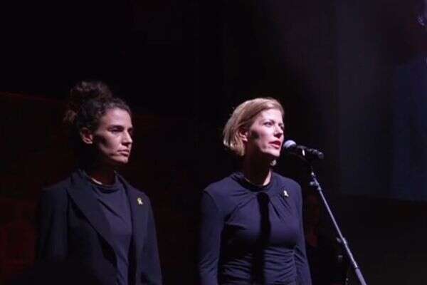 מרב סבירסקי וכרמית פלטי קציר מכבות את משואת הפקרת החטופים. "זה לא כבוד גדול להיות פה. לא עשינו דבר כדי לזכות בתארים שקיבלנו השנה. המציאות כפתה אותם עלינו, אנחנו משפחות הנרצחים, משפחות החטופים, משפחות החטופים שנרצחו בשבי.