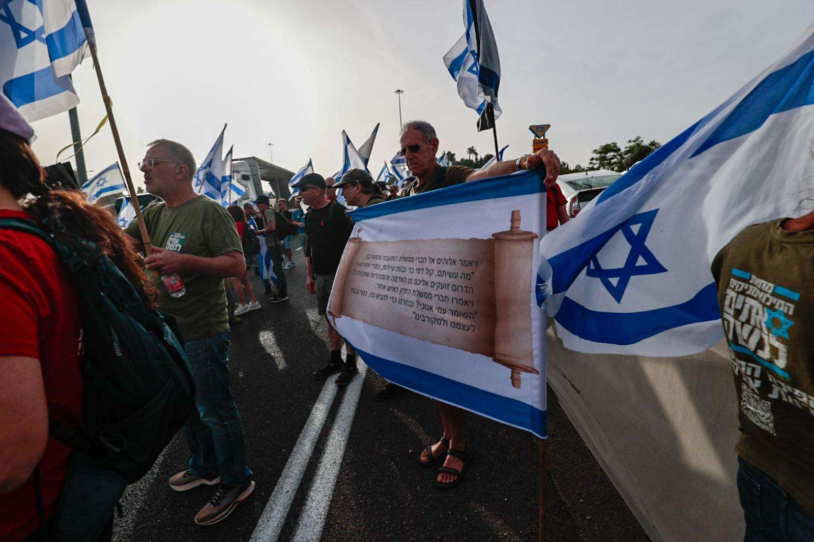 הבוקר מפגינים הגיעו סמוך לשער הגיא בכביש 1 ונעמדו בשוליים כשהם מחזיקים בתמונות החטופות והחטופים ושלטים נגד חוק הגיוס במתכונתו של נתניהו.