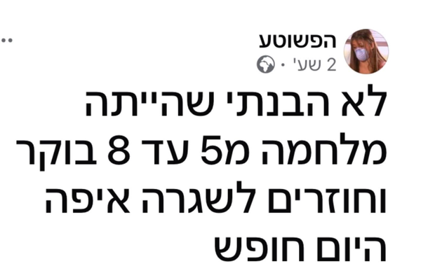 כבר ב-6 בבוקר העלתה "הפשוטע" לעמוד הפופולרי שלה לא פחות מ-3 פוסטים, אחד אחרי השני. "תסלחו לי רגע, עובדים או לא?", נכתב בפוסט הראשון, שהצליח לבטא במדויק את תחושת הכאוס שכל ישראלי התעורר איתה עם קבלת החדשות. בהמשך, תהתה הפשוטע: "לא הבנתי שהייתה מלחמה מ-5 עד 8 בבוקר וחוזרים לשגרה, איפה היום חופש?".