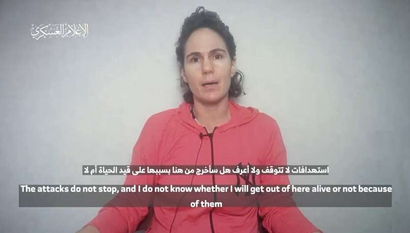 "אני מוחזקת בשבי עם מעט אוכל, מים, תנאי היגיינה ירודים, הפצצות בלתי פוסקות ובעיקר בלי לדעת אם אני הולכת לצאת מכאן בחיים. ב-7 באוקטובר אני ושאר תושבי בארי הופקרנו לגורלנו. אני מתחננת ומפצירה מבפני ממשלת ישראל וראש הממשלה בנימין נתניהו - בבקשה הפסיקו עם ההפקרות הזאת, הפסיקו עם ההפצצות ותחזירו אותנו הביתה".