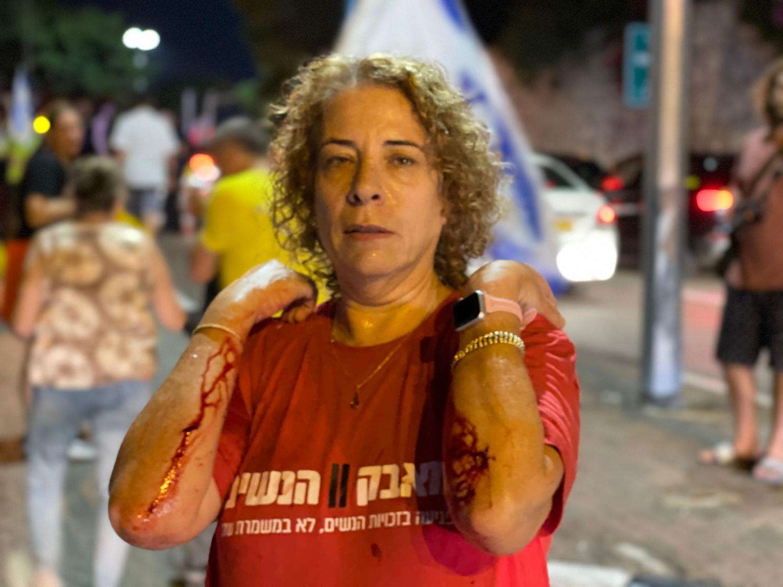 יונתן, בן 26 מחיפה סיפר: "הייתי בהפגנה במרכז חורב, הייתה שם חסימה שכמה אנשים ארגנו. כשהגעתי התיישבתי על הכביש כחלק מהחסימה. באו שוטרים, גררו אותי, חזרתי. ישבתי, שילבתי ידיים עם עוד אנשים שישבו סביבי, לחזק את החסימה. באו הפעילו לחץ על היד. השוטר שהיה מעליי נתן לי אגרופים בחזה, אמר לי 'אני אשבור אותך, אני אז**ן אותך'. אחר כך הוא ועוד שוטר גררו אותי על הכביש, וזרקו אותי על גדר תיל שנכנסה לראש. נהיה לי חתך מאוד רציני. בבית חולים אמרו שזה הכי גדול שראו בפער לפחות כבר הרבה זמן. עברתי תפרים, יש לי עוד צילום לעשות".