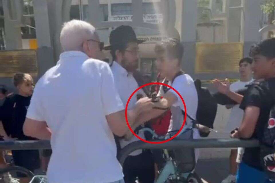 בתיעוד נראה אדם מבוגר תוקף ילד ואברך חב"ד בכניסה לגימנסיה בתל אביב. האדם תקף פיזית את האברך ומשך את התפילין מידו של הנער.