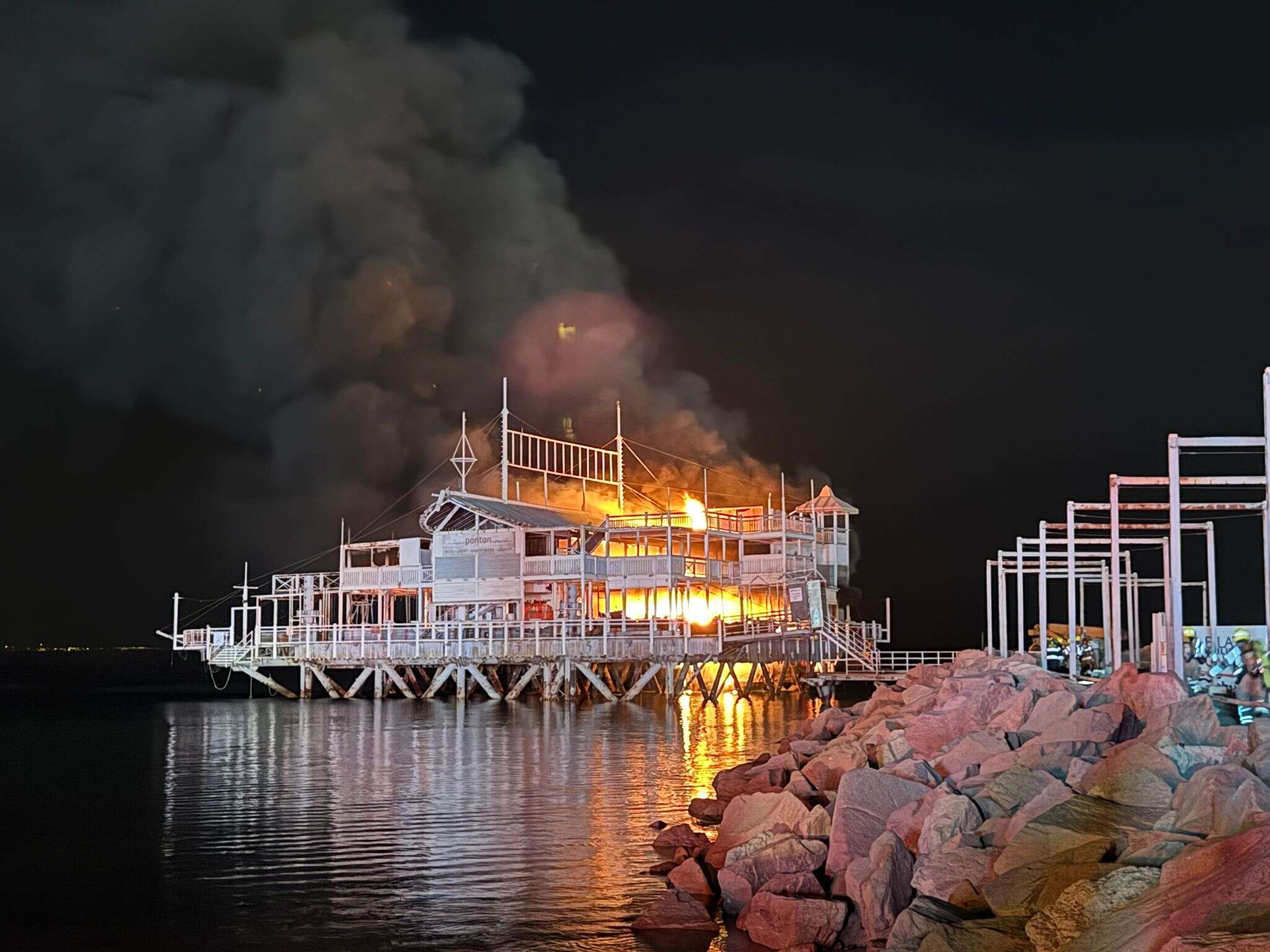 תיעוד: לוחמי האש פועלים בשעה זו (חמישי) לכיבוי פונטון בוער הצמוד לשובר הגלים בחוף הצפוני באילת, סמוך לרפסודת "פונטון אילת".