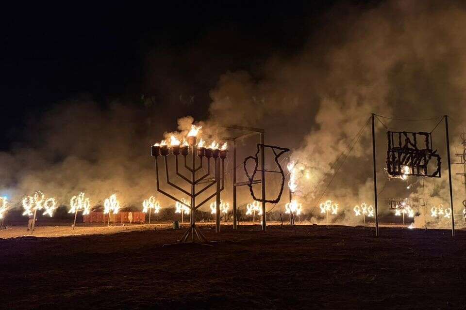 מאירים את הצפון: מתנדבי ארגון הסיוע האזרחי ״לב אחד״ הדליקו נר שמיני של חנוכה בפסל האריה השואג שהפך לסמל במלחמה, עם תושבי קיבוץ כפר גלעדי-תל חי יחד עם עוד 25 מוקדי הדלקה לכל אורך גבול הצפון מראש הנקרה ועד החרמון.