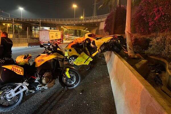 שני צעירים כבני 25 ו-22 נפצעו באורח קשה בהתנגשות רכב במעקה בטיחות בדרך יגאל ידין בתל אביב. צוותי מד"א פינו אותם לבית החולים וולפסון בחולון.