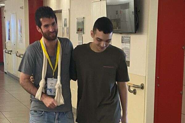 הפגישה המרגשת בבית החולים איכילוב. שורד השבי, שגיא דקל חן, ביקר בימים האחרונים את שורד השבי עידן אלכסנדר, כשהיה בבית החולים.