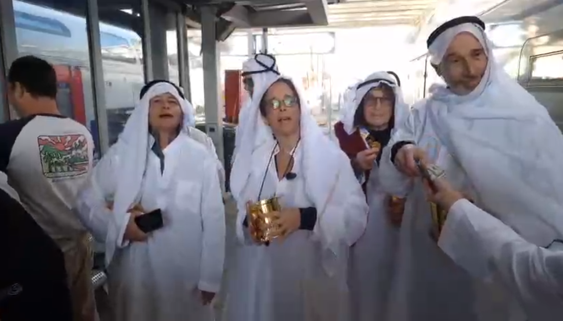 פעילים ברכבת ישראל לבושים כשייחים קטארים במיצג מחאה על מעורבות ממשלת קטאר בלשכת רה"מ / ללא קרדיט