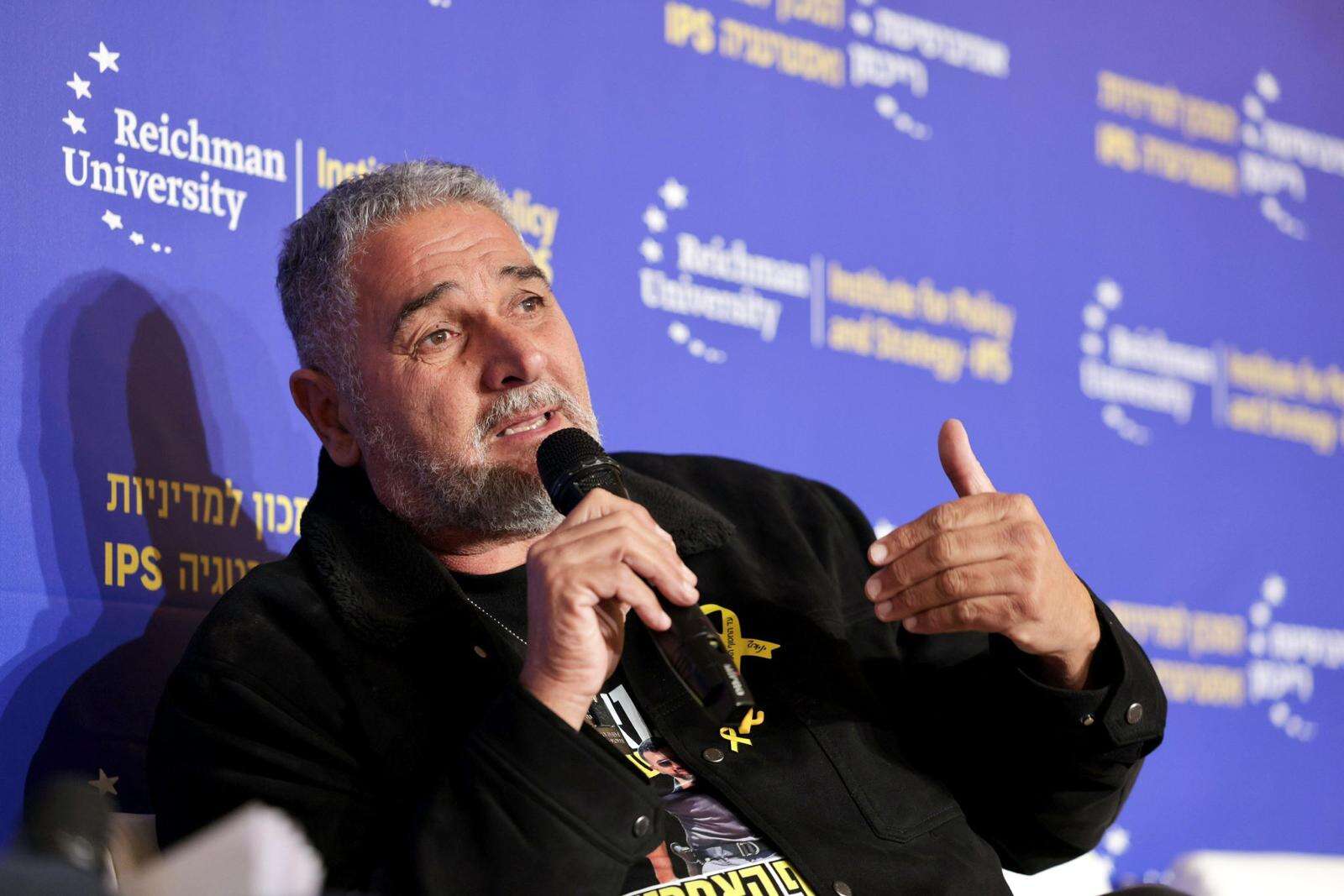 איציק גואילי, אביו של רס"ר רן גואילי החטוף האחרון בעזה, בכנס "מהישגים צבאיים למדיניים" בהובלת המכון למדיניות ואסטרטגיה (IPS) באוניברסיטת רייכמן: ״טראמפ הסתכל לי ולאשתי בעיניים והתחייב בנוכחותם של וויטקוף וקושינר שהוא מחזיר לנו את הילד״.