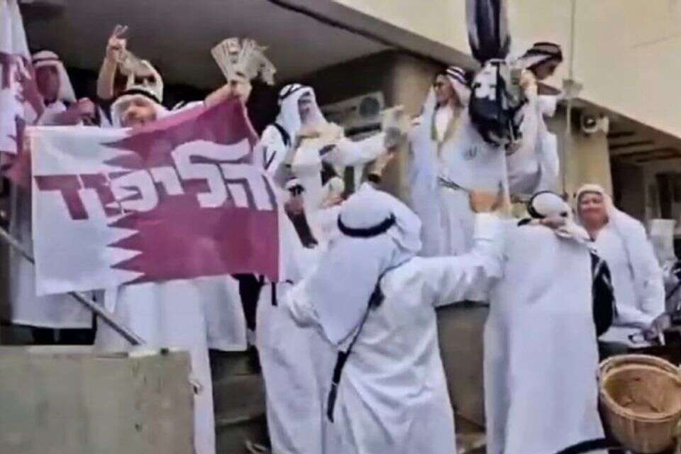 מפגינים מחופשים ל"שייח'ים קטארים" מפזרים דולרים מחוץ למשרדי הליכוד בתל אביב // מתוך ה-X